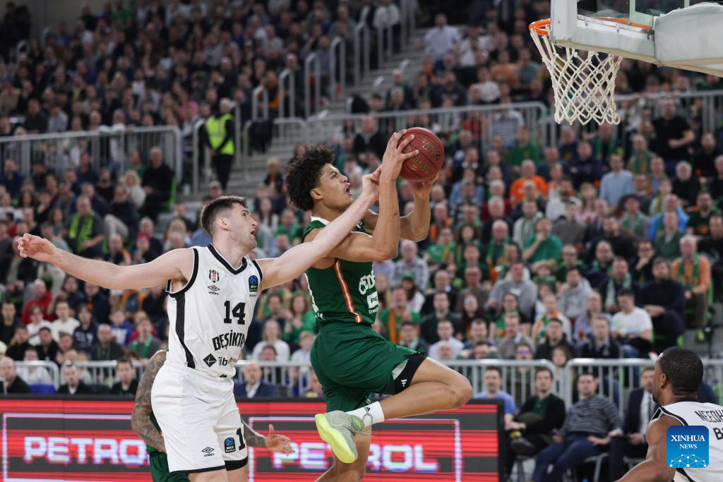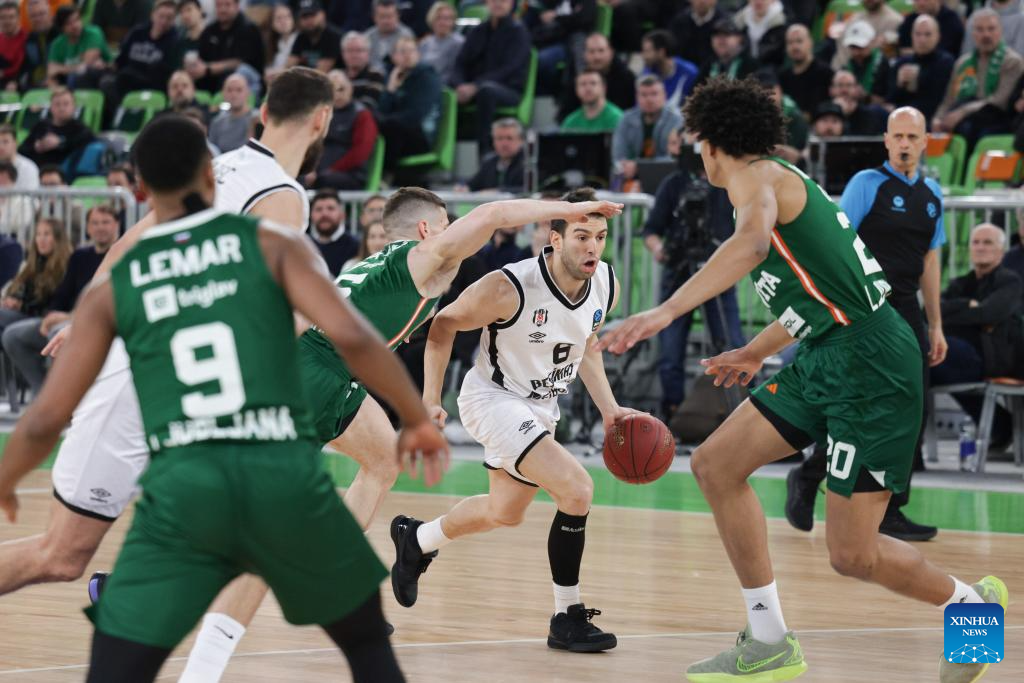 Berk Ugurlu (2nd R) of Besiktas Fibabanka Istanbul competes during the eighthfinals of the BKT Euro Cup 2024/25 between Cedevita Olimpija Ljubljana and Besiktas Fibabanka Istanbul in Ljubljana, Slovenia, March 5, 2025. (Photo by Zeljko Stevanic/Xinhua)