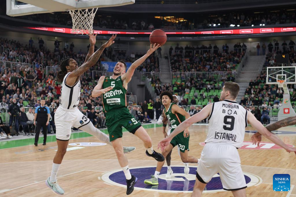Aleksej Nikolic (2nd L) of Cedevita Olimpija Ljubljana goes for a layup during the eighthfinals of the BKT Euro Cup 2024/25 between Cedevita Olimpija Ljubljana and Besiktas Fibabanka Istanbul in Ljubljana, Slovenia, March 5, 2025. (Photo by Zeljko Stevanic/Xinhua)