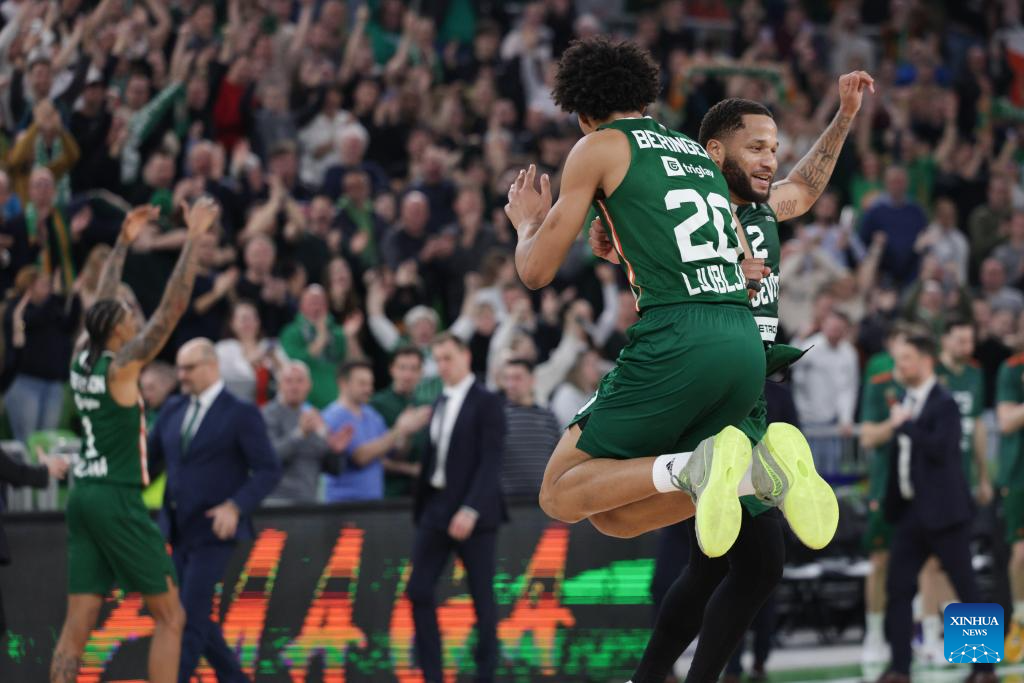 Team Cedevita Olimpija Ljubljana celebrate victory after the eighthfinals of the BKT Euro Cup 2024/25 between Cedevita Olimpija Ljubljana and Besiktas Fibabanka Istanbul in Ljubljana, Slovenia, March 5, 2025. (Photo by Zeljko Stevanic/Xinhua)