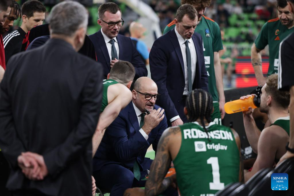 Zvezdan Mitrovic (C), head coach of Cedevita Olimpija Ljubljana, instructs the players during the eighthfinals of the BKT Euro Cup 2024/25 between Cedevita Olimpija Ljubljana and Besiktas Fibabanka Istanbul in Ljubljana, Slovenia, March 5, 2025. (Photo by Zeljko Stevanic/Xinhua)