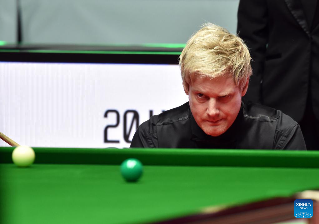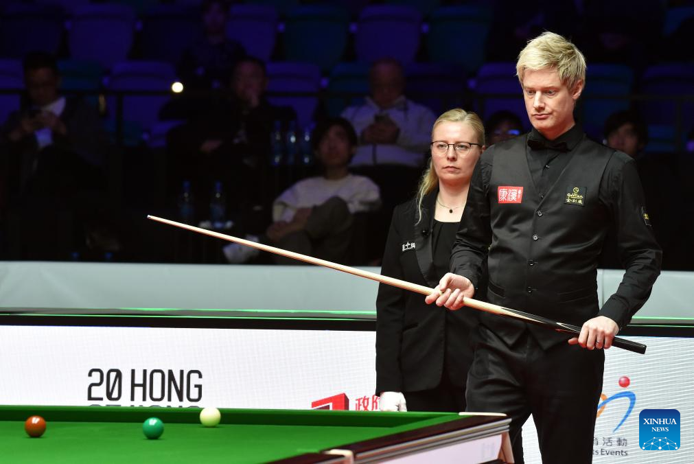 Neil Robertson (R) of Australia reacts during the second round match against David Gilbert of England at the Snooker World Grand Prix 2025 in Hong Kong, south China, March 6, 2025. (Xinhua/Lo Ping Fai)