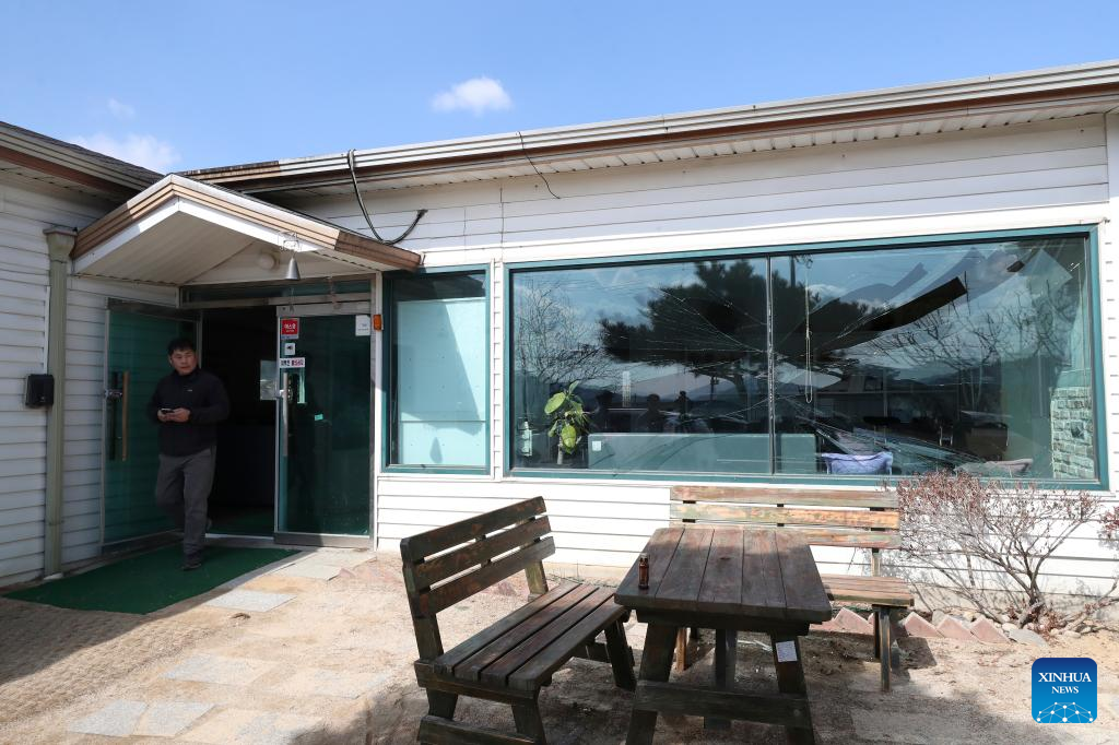 This photo shows a building damaged after a fighter jet dropped bombs on South Korea's civilian area by accident during live-fire drills in Pocheon, South Korea, March 6, 2025.