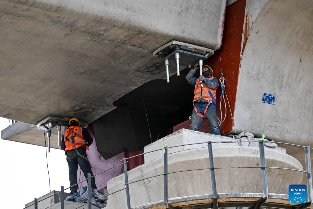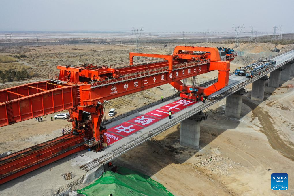Bridge builders work at the construction site of the Heyuancun Grand Bridge of Baotou-Yinchuan High-speed Railway in north China's Inner Mongolia Autonomous Region, March 6, 2025. The Heyuancun Grand Bridge was successfully closed on Thursday, marking the completion of the bridges and tunnels within the Inner Mongolia section of Baotou-Yinchuan High-speed Railway, which links Baotou in Inner Mongolia and Yinchuan in northwest China's Ningxia Hui Autonomous Region. (Xinhua/Li Zhipeng)
