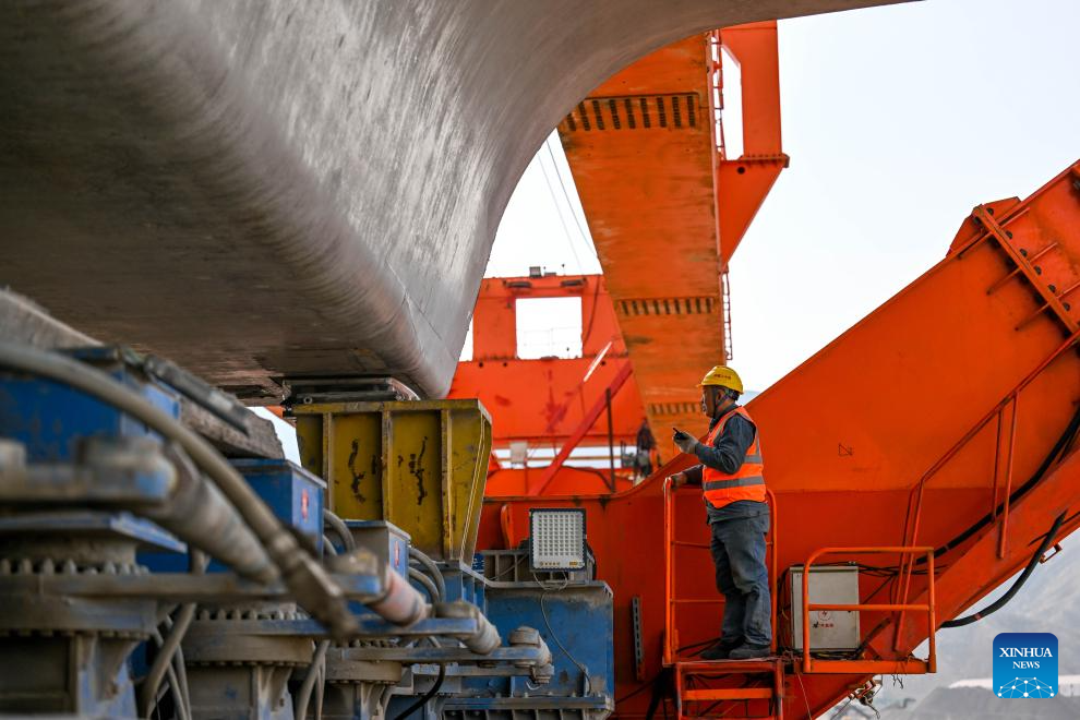 A bridge builder works at the construction site of the Heyuancun Grand Bridge of Baotou-Yinchuan High-speed Railway in north China's Inner Mongolia Autonomous Region, March 6, 2025. The Heyuancun Grand Bridge was successfully closed on Thursday, marking the completion of the bridges and tunnels within the Inner Mongolia section of Baotou-Yinchuan High-speed Railway, which links Baotou in Inner Mongolia and Yinchuan in northwest China's Ningxia Hui Autonomous Region. (Xinhua/Li Zhipeng)