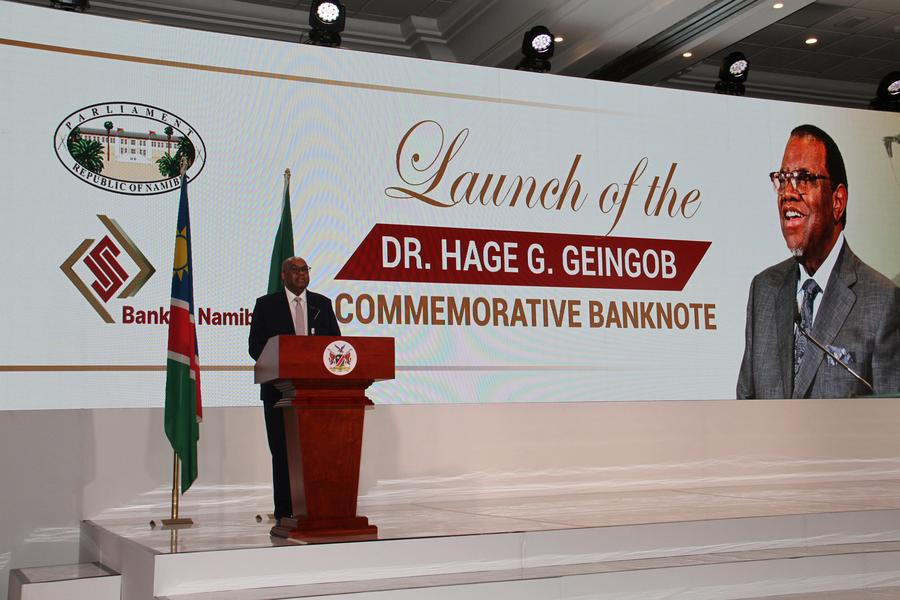 Namibian President Nangolo Mbumba unveiled the Hage Geingob commemorative banknote on Wednesday at a launch event in Windhoek, the country's capital.