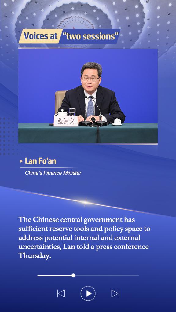 BEIJING, March 6 (Xinhua) -- The Chinese central government has sufficient reserve tools and policy space to address potential internal and external uncertainties, Finance Minister Lan Fo'an told a press conference Thursday.■