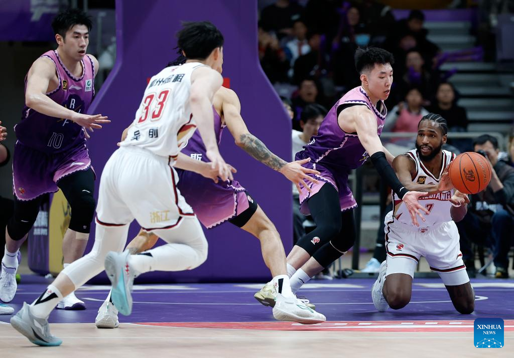Ruben Nembhard (1st R) of Zhejiang Golden Bulls competes during the 36th round match between Beijing Royal Fighters and Zhejiang Golden Bulls at the 2024-2025 Chinese Basketball Association (CBA) league in Beijing, China, March 6, 2025. (Xinhua/Wang Lili)