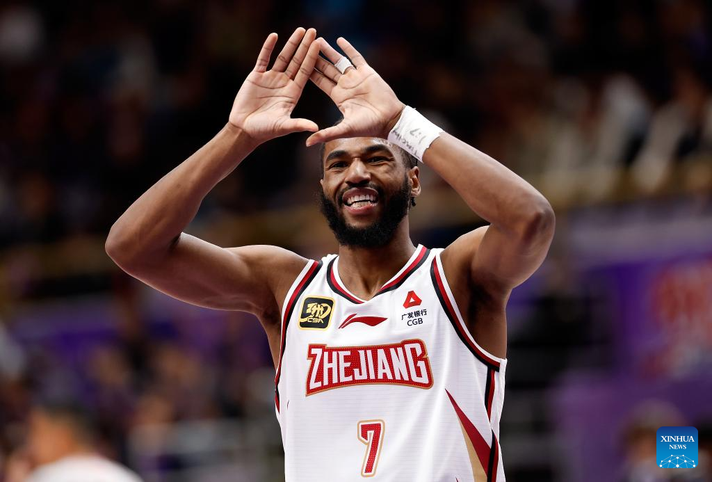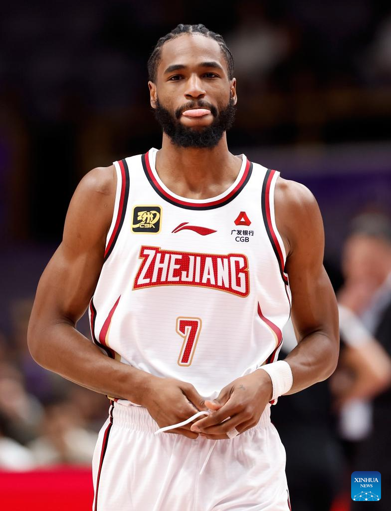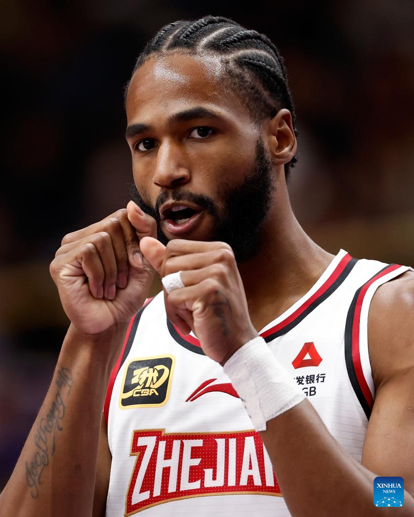 Ruben Nembhard of Zhejiang Golden Bulls reacts during the 36th round match between Beijing Royal Fighters and Zhejiang Golden Bulls at the 2024-2025 Chinese Basketball Association (CBA) league in Beijing, China, March 6, 2025. (Xinhua/Wang Lili)