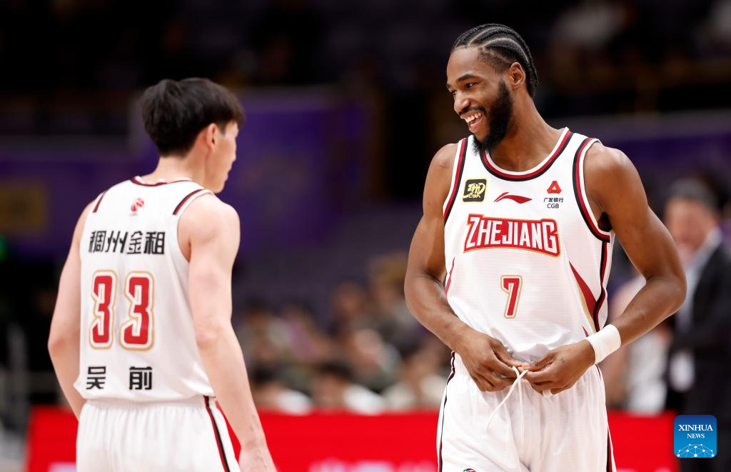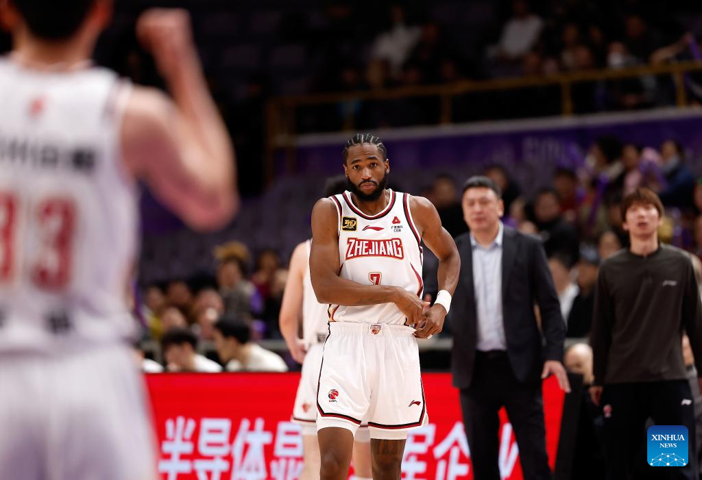 Ruben Nembhard (R) of Zhejiang Golden Bulls reacts during the 36th round match between Beijing Royal Fighters and Zhejiang Golden Bulls at the 2024-2025 Chinese Basketball Association (CBA) league in Beijing, China, March 6, 2025. (Xinhua/Wang Lili)