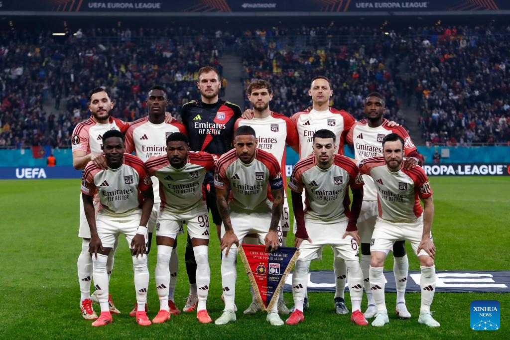 Players of Olympique Lyonnais line up before the UEFA Europa League round of 16 1st leg match between FCSB and Olympique Lyonnais at Arena Nationala stadium in Bucharest, Romania, March 6, 2025. (Photo by Cristian Cristel/Xinhua)