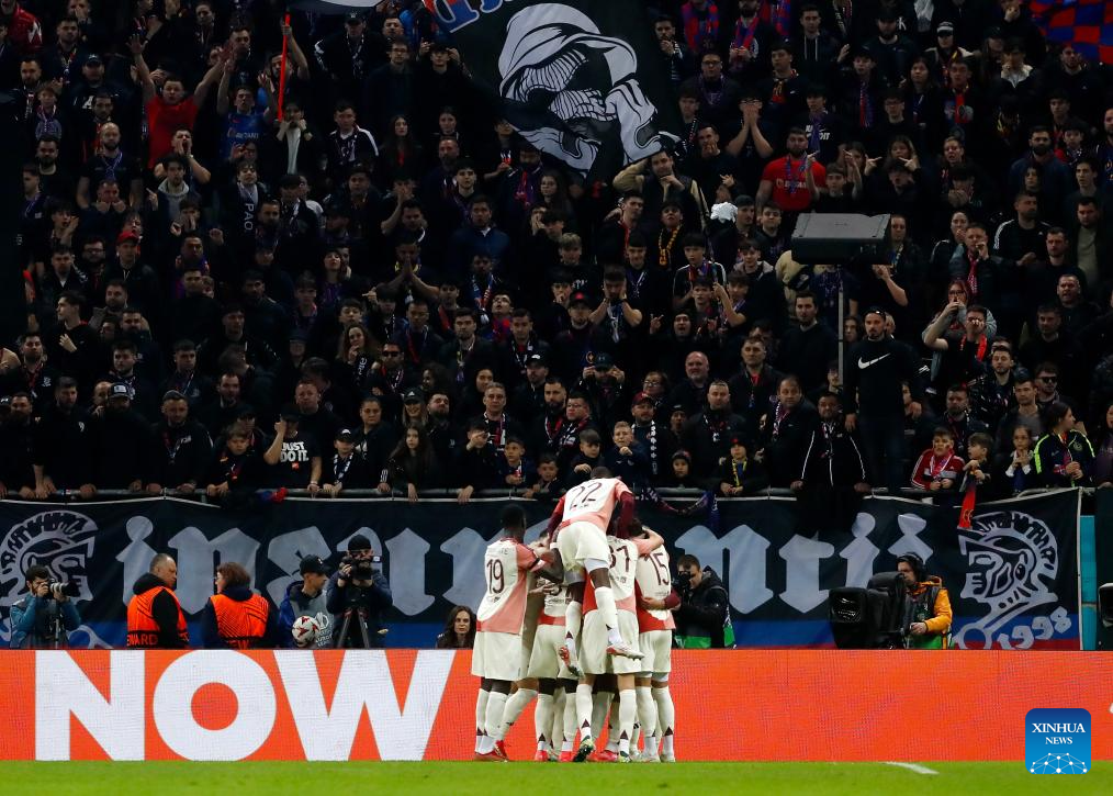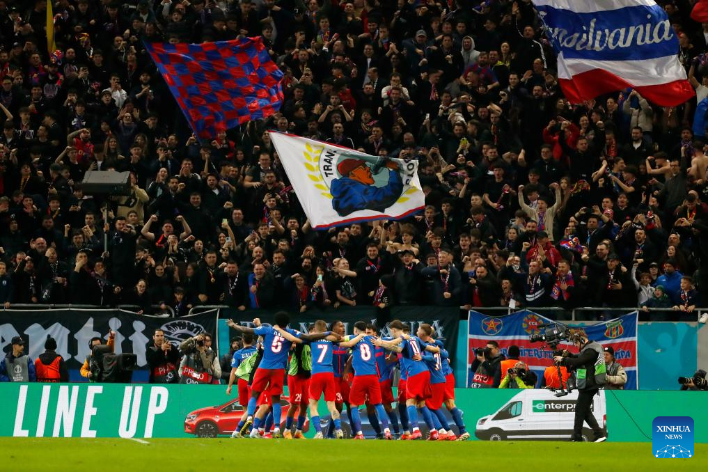 Players of FCSB celebrate a goal during the UEFA Europa League round of 16 1st leg match between FCSB and Olympique Lyonnais at Arena Nationala stadium in Bucharest, Romania, March 6, 2025. (Photo by Cristian Cristel/Xinhua)