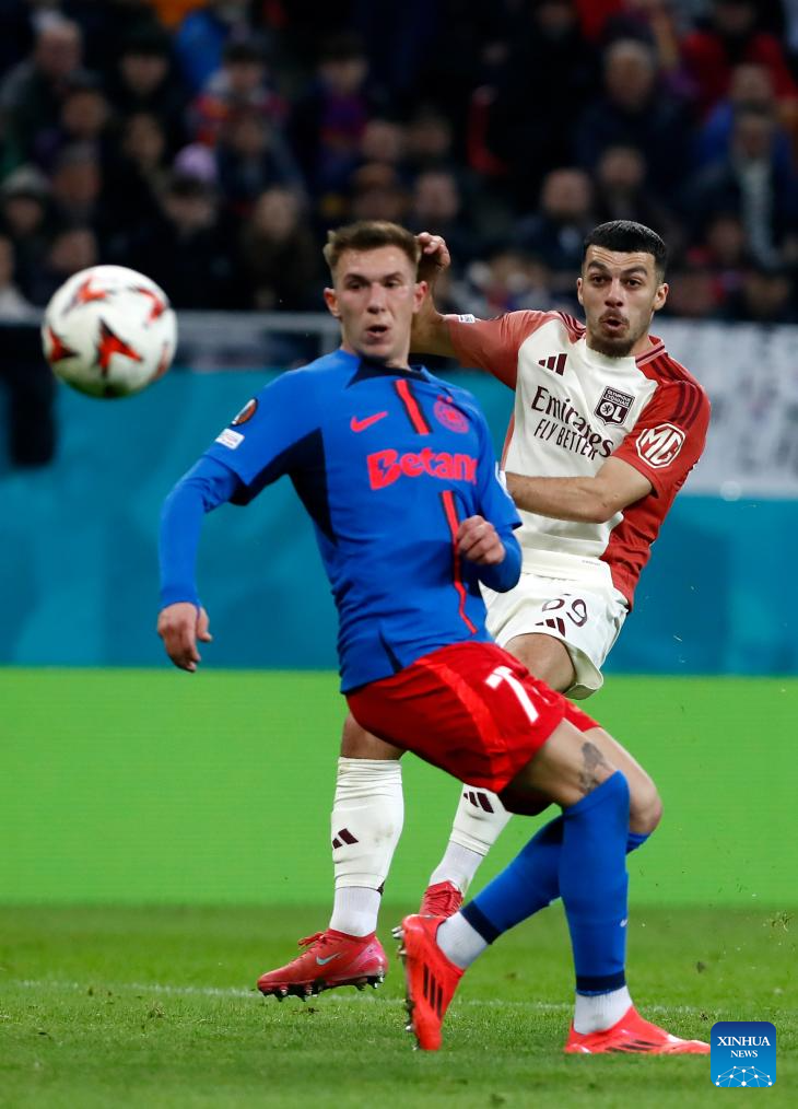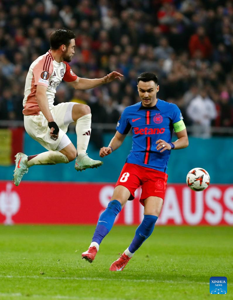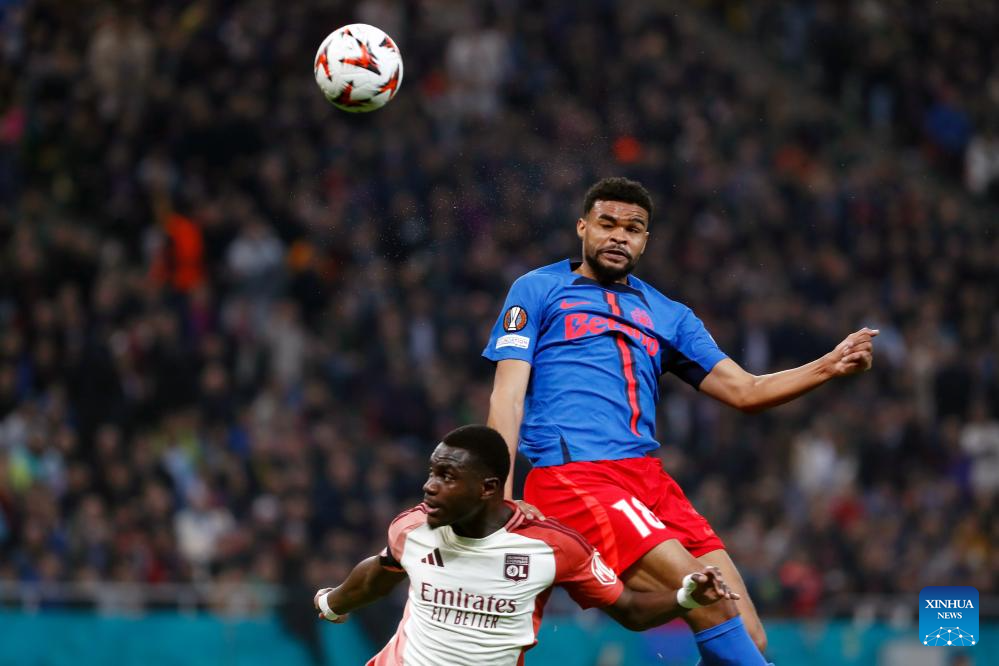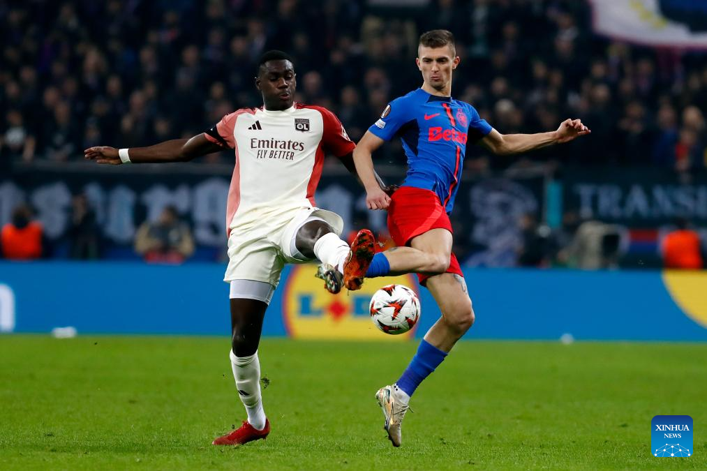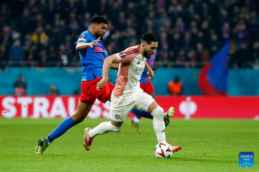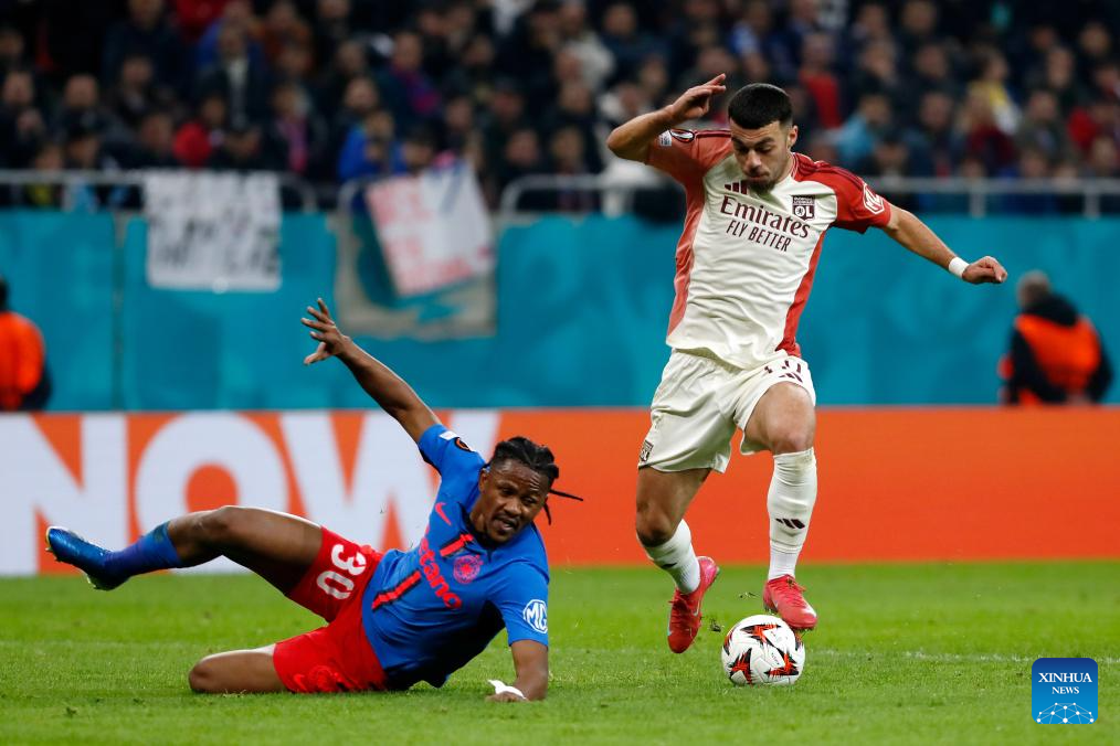 Rayan Cherki (R) of Olympique Lyonnais vies with Malcom Edjouma of FCSB during the UEFA Europa League round of 16 1st leg match between FCSB and Olympique Lyonnais at Arena Nationala stadium in Bucharest, Romania, March 6, 2025. (Photo by Cristian Cristel/Xinhua)
