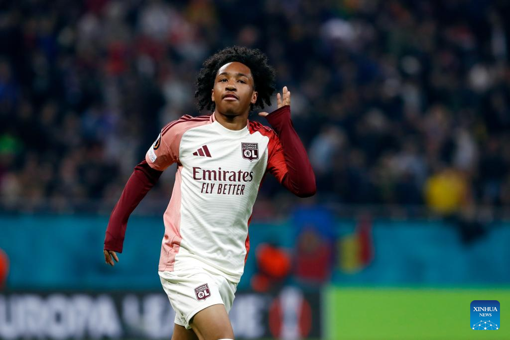 Malick Fofana of Olympique Lyonnais celebrates his goal during the UEFA Europa League round of 16 1st leg match between FCSB and Olympique Lyonnais at Arena Nationala stadium in Bucharest, Romania, March 6, 2025. (Photo by Cristian Cristel/Xinhua)