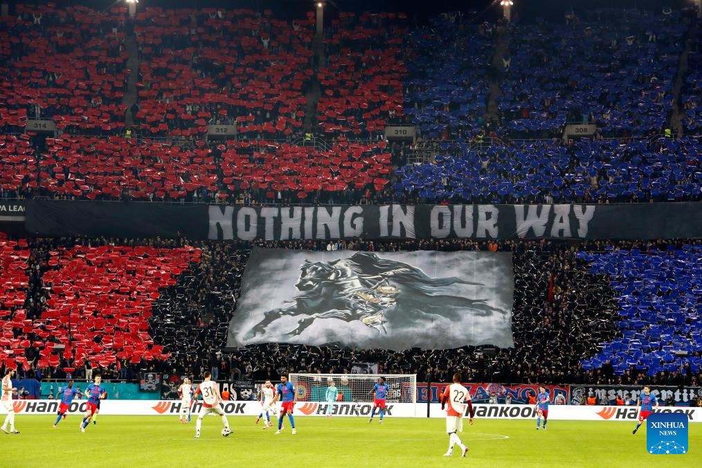 FCSB's fans cheer for their team during the UEFA Europa League round of 16 1st leg match between FCSB and Olympique Lyonnais at Arena Nationala stadium in Bucharest, Romania, March 6, 2025. (Photo by Cristian Cristel/Xinhua)
