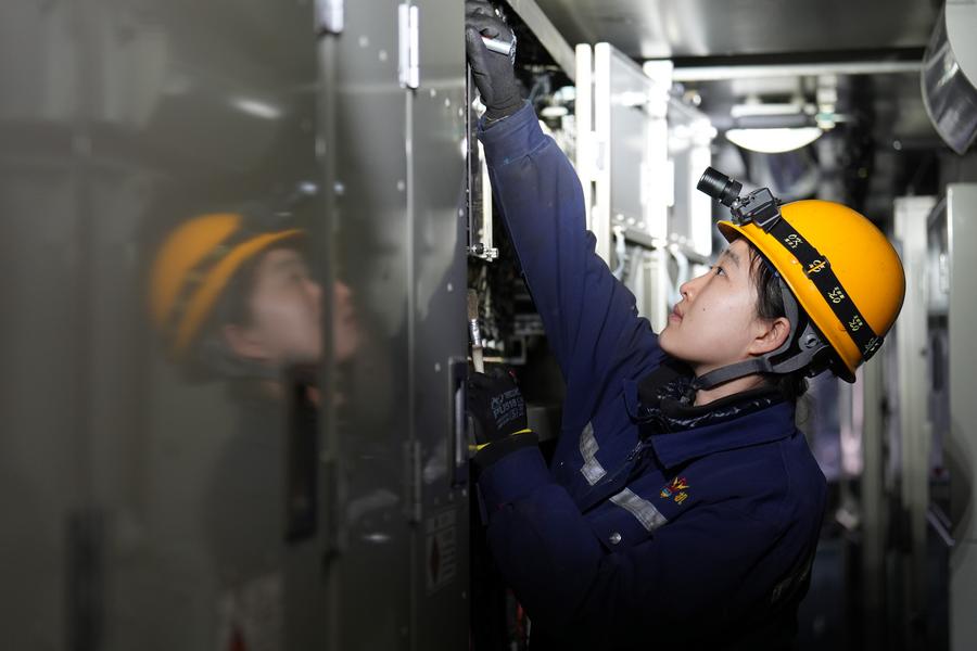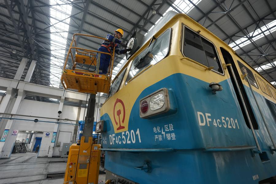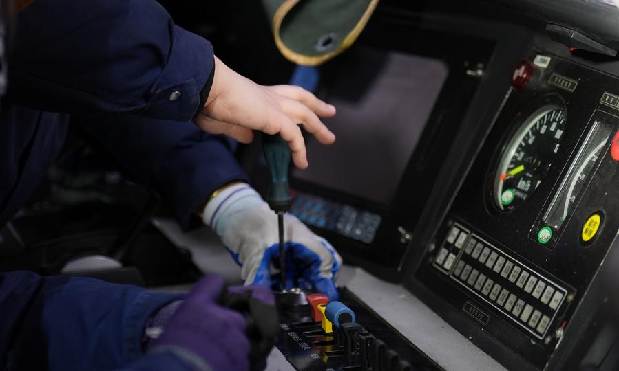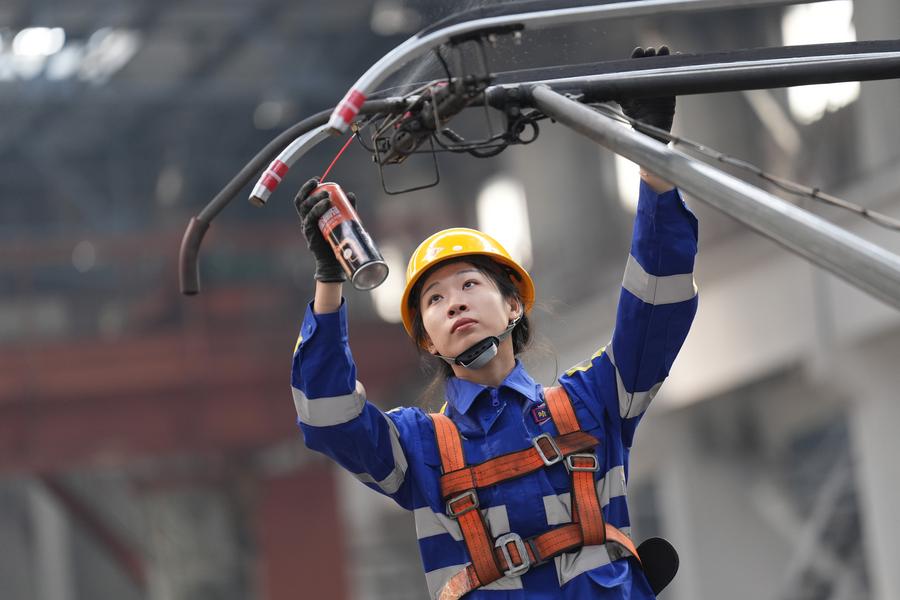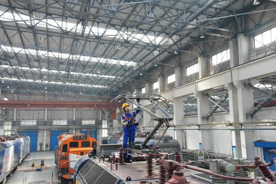 Wang Jiayi, a train mechanic, maintains a pantograph on a locomotive at a depot of China Railway Harbin Group Co., Ltd. in Harbin, northeast China's Heilongjiang Province, March 6, 2025. (Xinhua/Wang Song)