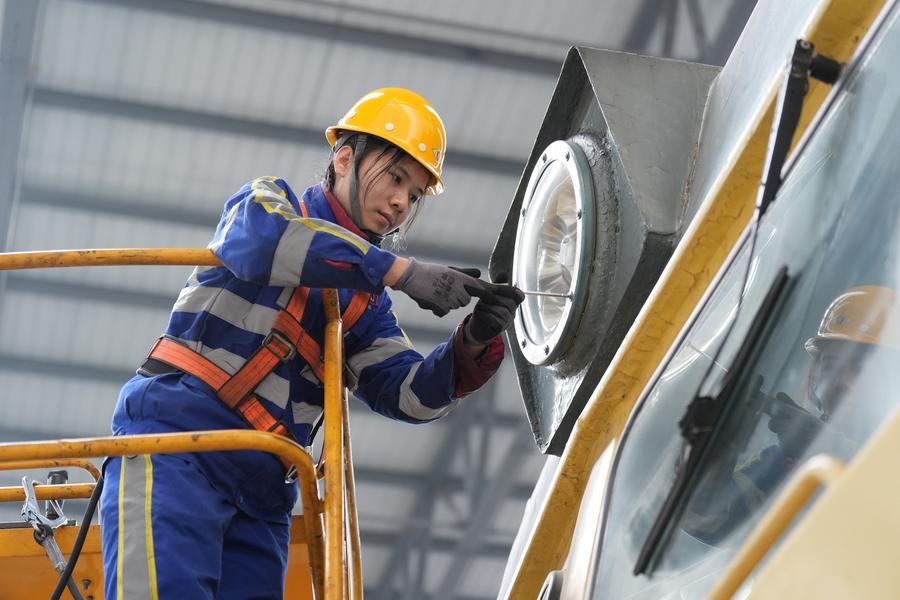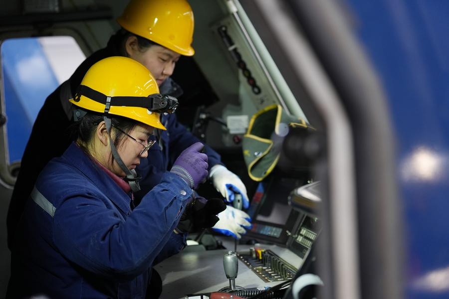 Li Linlin, a train mechanic, maintains a locomotive headlight at a depot of China Railway Harbin Group Co., Ltd. in Harbin, northeast China's Heilongjiang Province, March 6, 2025. (Xinhua/Wang Song)Wang Jiayi, a train mechanic, tests a pantograph on a locomotive at a depot of China Railway Harbin Group Co., Ltd. in Harbin, northeast China's Heilongjiang Province, March 6, 2025. (Xinhua/Wang Song)Li Linlin, a train mechanic, maintains a locomotive headlight at a depot of China Railway Harbin Group Co., Ltd. in Harbin, northeast China's Heilongjiang Province, March 6, 2025. (Xinhua/Wang Song)Chen Feiyu, a mechanic, checks a converter box at a depot of China Railway Harbin Group Co., Ltd. in Harbin, northeast China's Heilongjiang Province, March 6, 2025. (Xinhua/Wang Song)Lin Zenglin (front) and Zhao Jiaqi, train mechanics, maintain the driving cab of a locomotive at a depot of China Railway Harbin Group Co., Ltd. in Harbin, northeast China's Heilongjiang Province, March 6, 2025. (Xinhua/Wang Song)Zhao Jiaqi, a train mechanic, maintains the driving cab of a locomotive at a depot of China Railway Harbin Group Co., Ltd. in Harbin, northeast China's Heilongjiang Province, March 6, 2025. (Xinhua/Wang Song)Members of a female maintenance team pose for a group photo at a depot of China Railway Harbin Group Co., Ltd. in Harbin, northeast China's Heilongjiang Province, March 6, 2025. (Xinhua/Wang Song)■