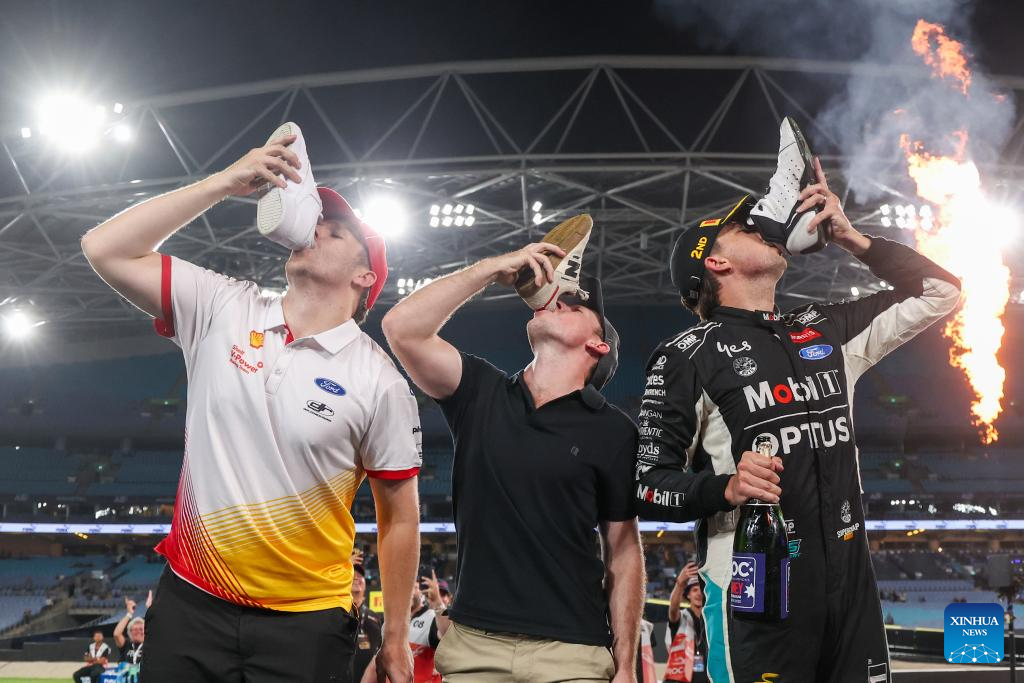 Runner-up Chaz Mostert (R) of Australia celebrates with teammates Brodie Kostecki (L) and Will Brown after the Race of Champions (ROC) at Accor Stadium in Sydney, Australia, March 8, 2025. (Photo by Qian Jun/Xinhua)