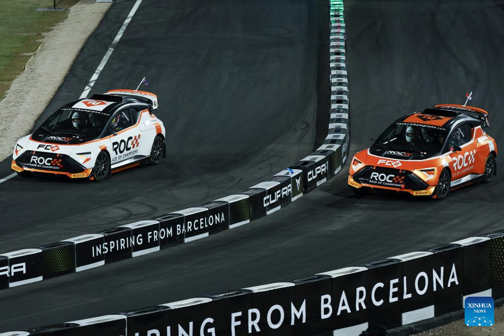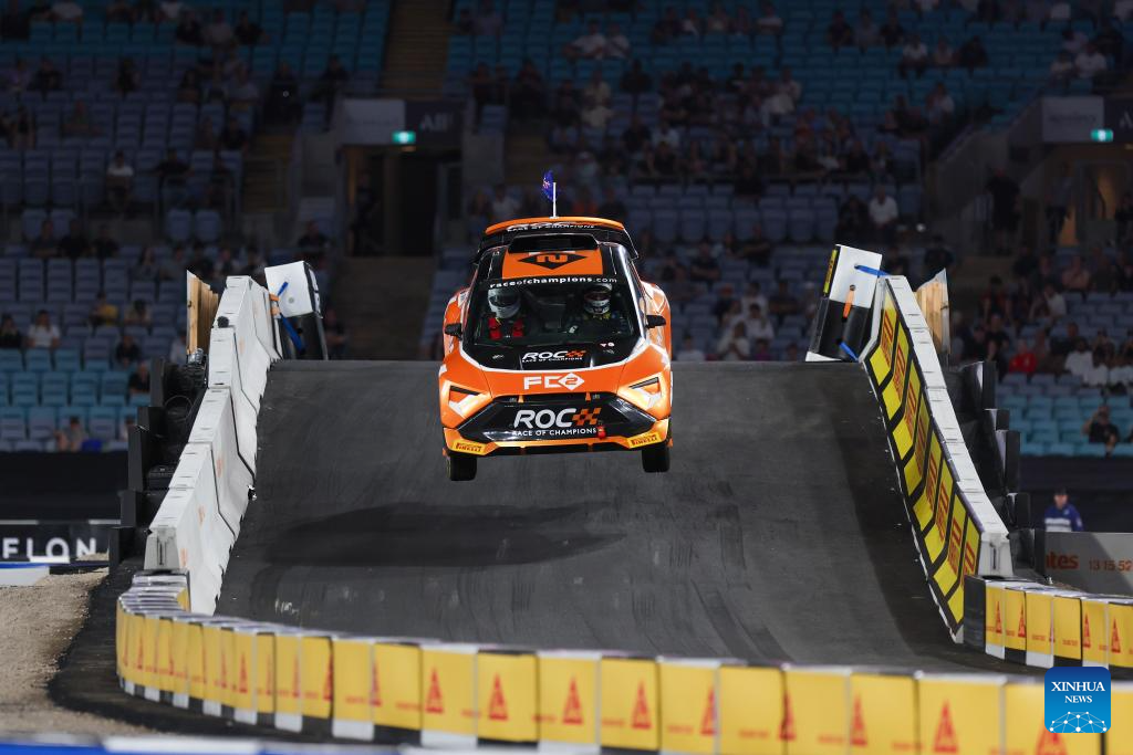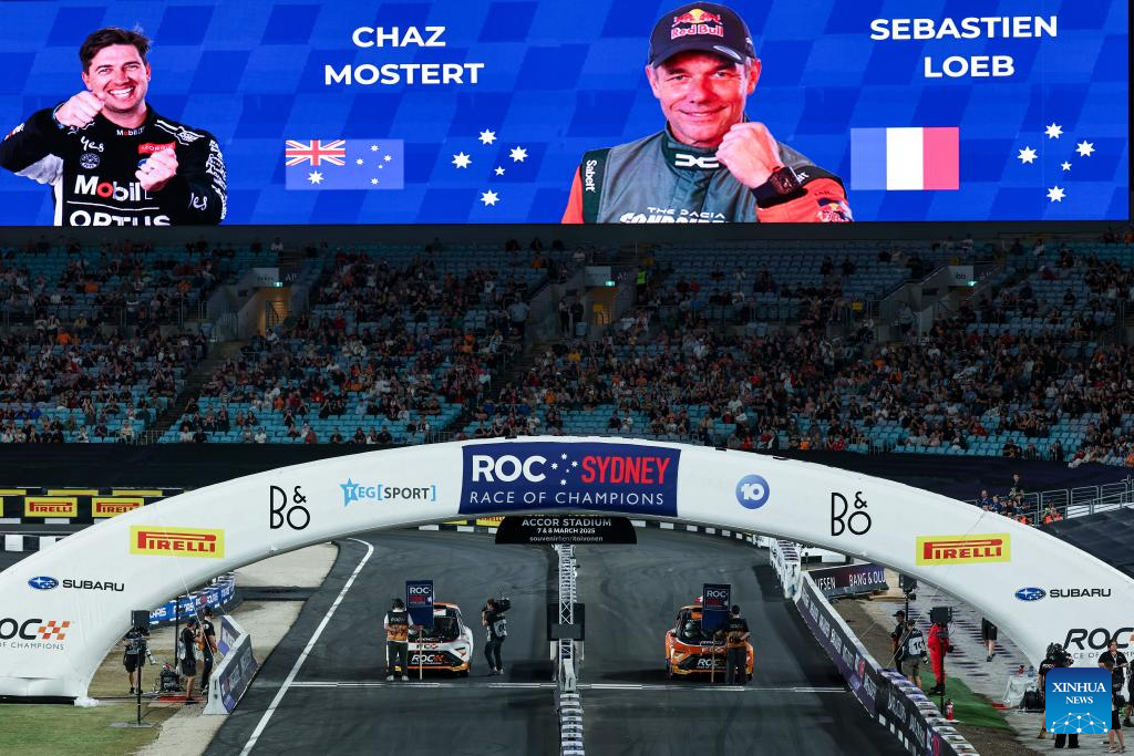 Sebastien Loeb (R) of France competes against Chaz Mostert of Australia during the final of the Race of Champions (ROC) at Accor Stadium in Sydney, Australia, March 8, 2025. (Photo by Qian Jun/Xinhua)