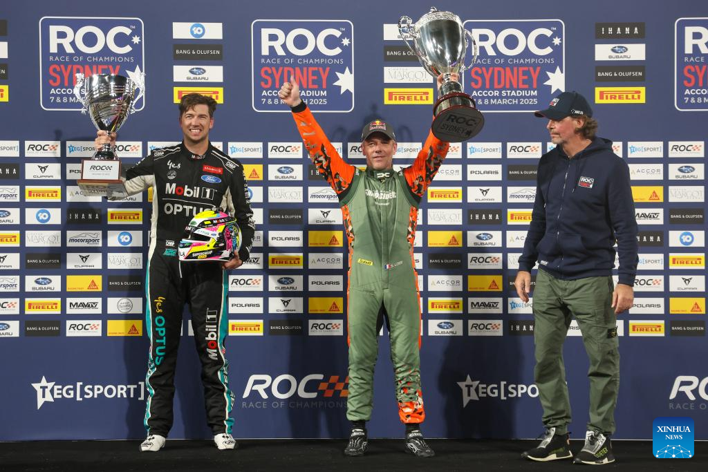 Winner Sebastien Loeb (C) of France and runner-up Chaz Mostert (L) of Australia hold the trophies during the awarding ceremony for the Race of Champions (ROC) at Accor Stadium in Sydney, Australia, March 8, 2025. (Photo by Qian Jun/Xinhua)