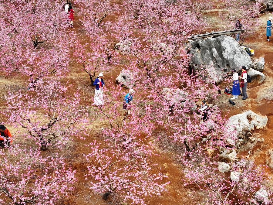 This drone photo shows people taking picture among peach blossoms in Gongcheng Yao Autonomous County, south China's Guangxi Zhuang Autonomous Region, March 8, 2025. (Xinhua/Zhou Hua)