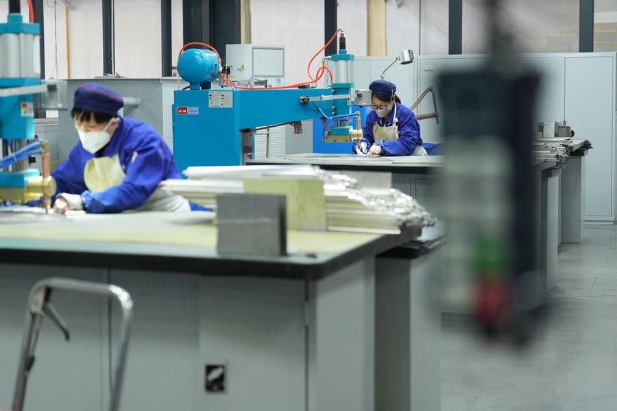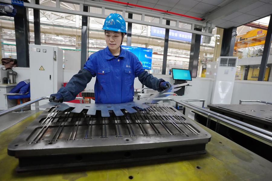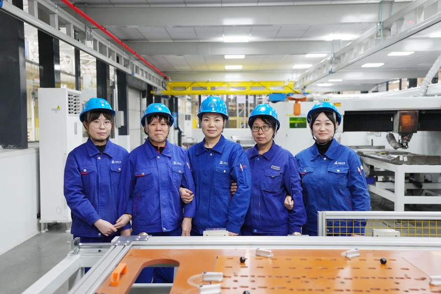 HARBIN, March 8 (Xinhua) -- Established in 1951, the spot welding team at a factory of Harbin Electric Machinery Company Limited now consists of nine members, five of them female. It is primarily responsible for the production of duct spacers for stator cores used in megawatt-level generators.