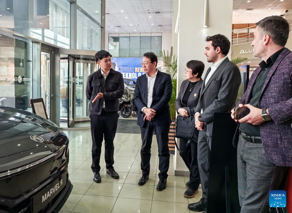 Feng Xingya (2nd L), a deputy to the 14th National People's Congress (NPC), learns about the sales of Chinese new energy vehicles in Istanbul, Türkiye, Feb. 27, 2025.(Xinhua)
