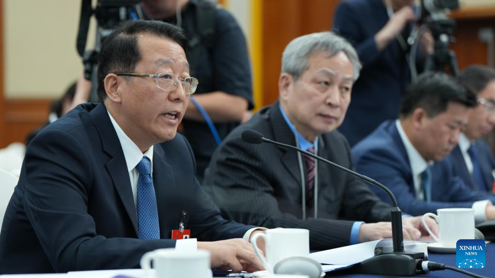 Feng Xingya (C), a deputy to the 14th National People's Congress (NPC), attends a group meeting of the delegation of Guangdong Province at the third session of the 14th NPC in Beijing, capital of China, March 6, 2025.(Xinhua/Liu Dawei)