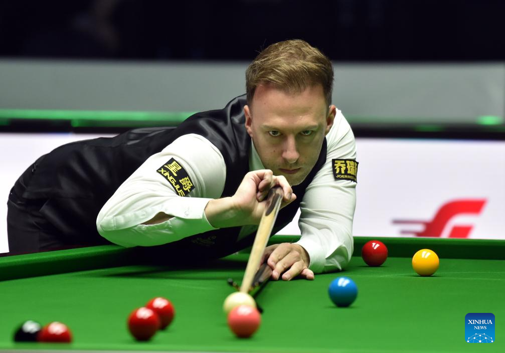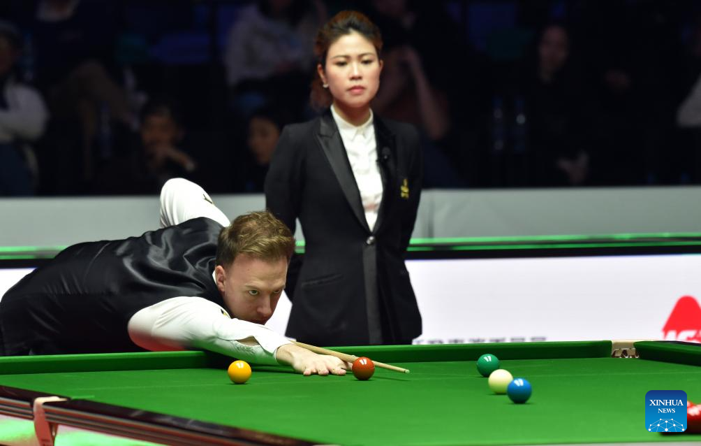 Judd Trump plays a shot during the semifinal match between England's Stuart Bingham and England's Judd Trump at the Snooker World Grand Prix 2025 in Hong Kong, south China, March 8, 2025. (Xinhua/Lo Ping Fai)