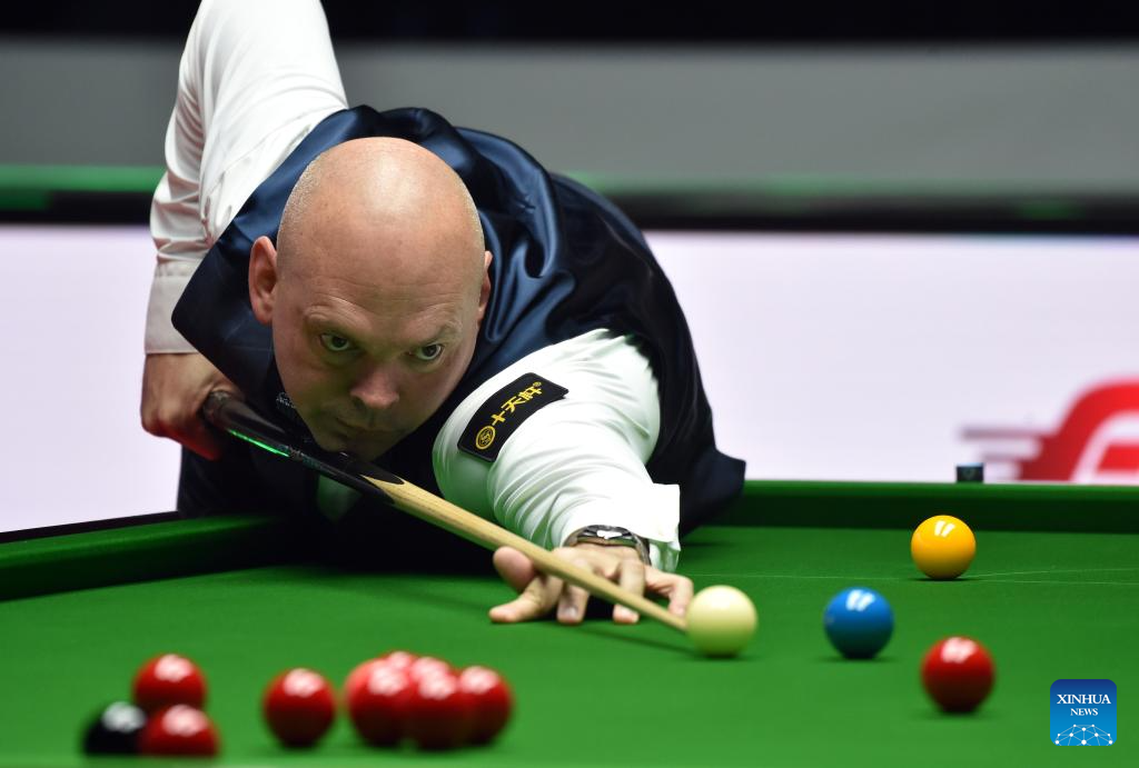 Stuart Bingham plays a shot during the semifinal match between England's Stuart Bingham and England's Judd Trump at the Snooker World Grand Prix 2025 in Hong Kong, south China, March 8, 2025. (Xinhua/Lo Ping Fai)