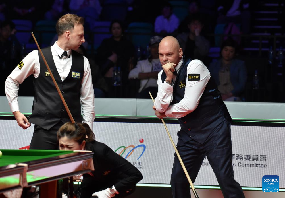 Stuart Bingham (R) and Judd Trump (L) react during the semifinal match between England's Stuart Bingham and England's Judd Trump at the Snooker World Grand Prix 2025 in Hong Kong, south China, March 8, 2025. (Xinhua/Lo Ping Fai)