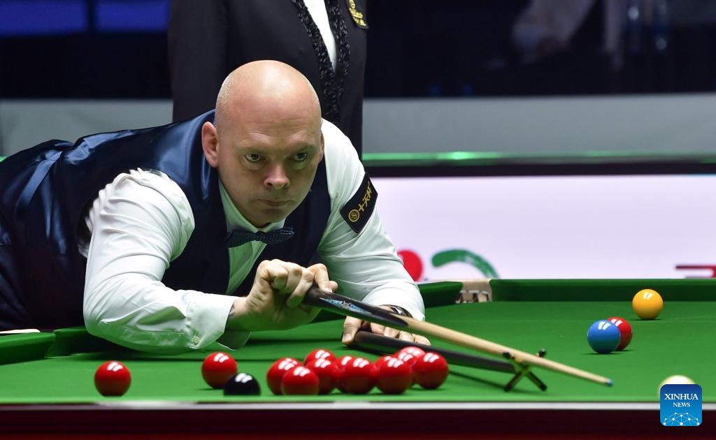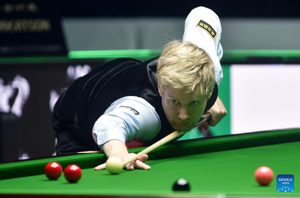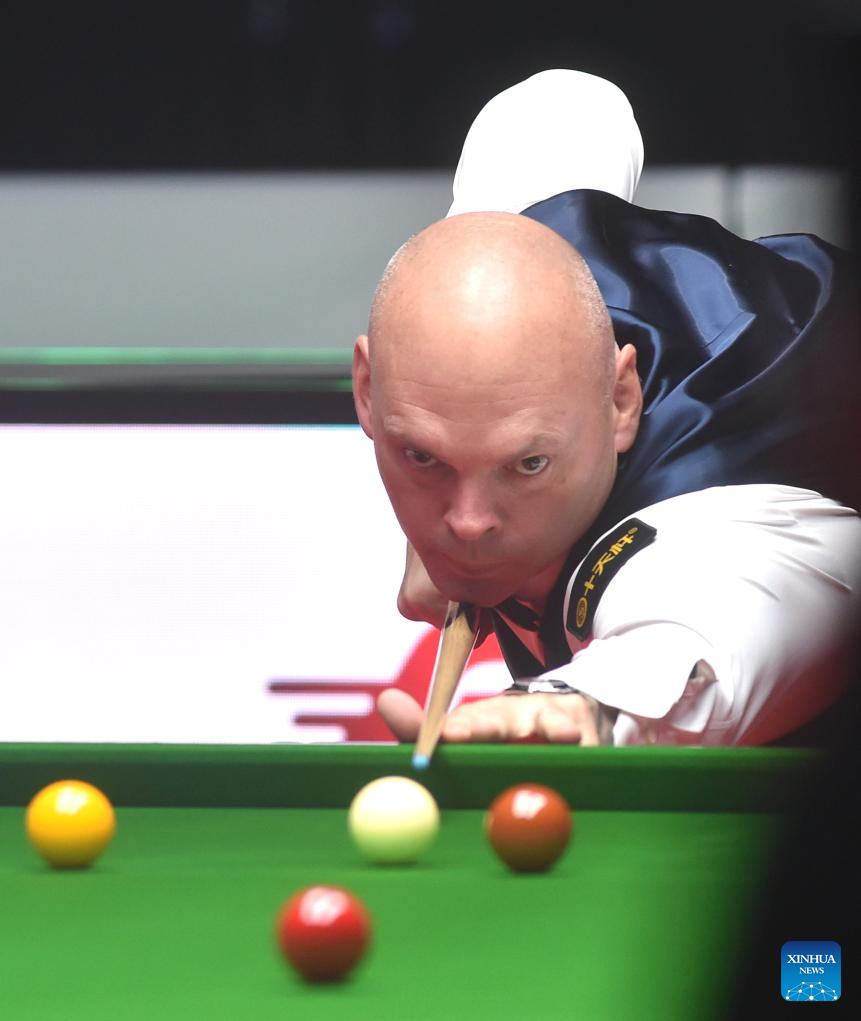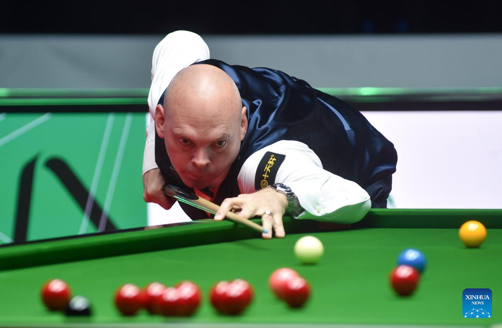 Stuart Bingham plays a shot during the final between Neil Robertson of Australia and Stuart Bingham of England at the Snooker World Grand Prix 2025 in Hong Kong, south China, March 9, 2025. (Xinhua/Lo Ping Fai)