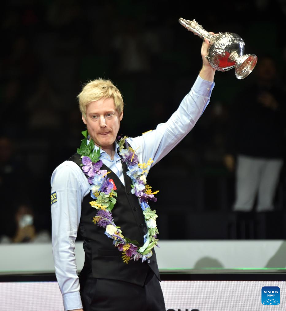 Neil Robertson celebrates with the trophy during the awarding ceremoy for the Snooker World Grand Prix 2025 in Hong Kong, south China, March 9, 2025. (Xinhua/Lo Ping Fai)