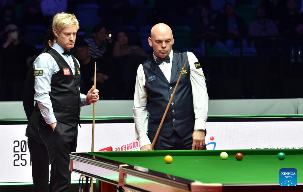Stuart Bingham (R) and Neil Robertson react during the final between Neil Robertson of Australia and Stuart Bingham of England at the Snooker World Grand Prix 2025 in Hong Kong, south China, March 9, 2025. (Xinhua/Lo Ping Fai)