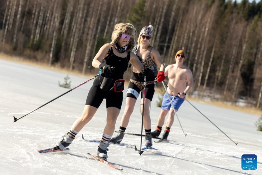 People wearing swimsuits participate in winter sports during the 4th Swimsuit Ski Show in Jamsa, Finland, March 8, 2025. (Photo by Matti Matikainen/Xinhua)