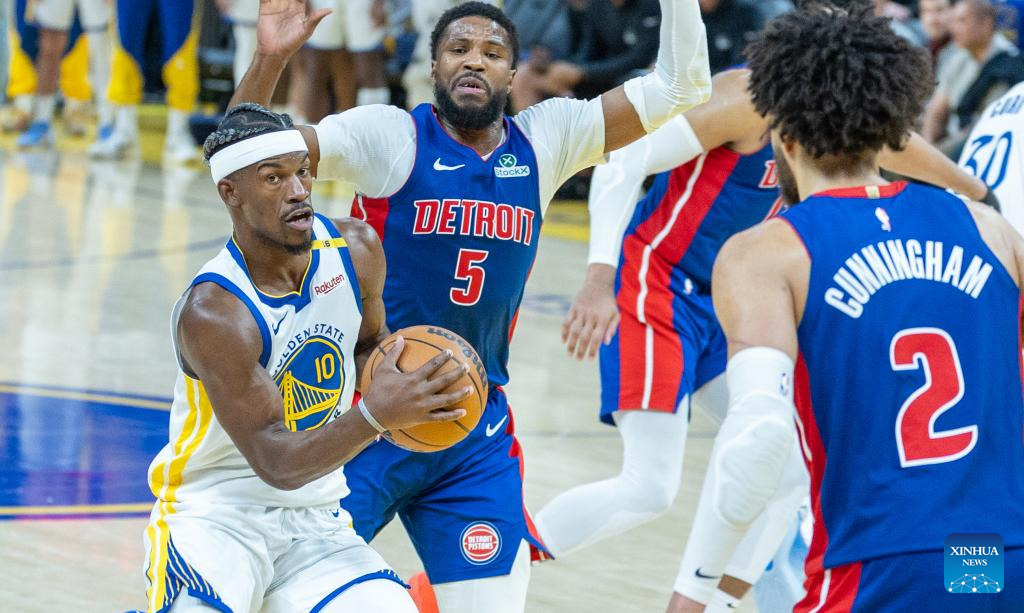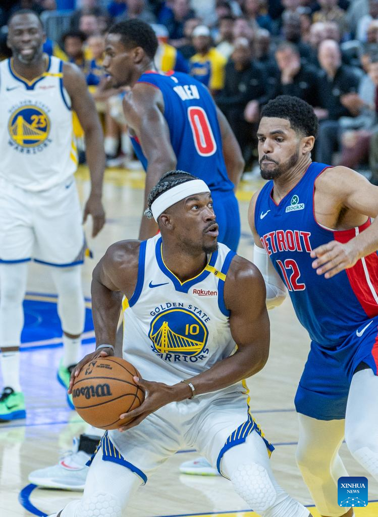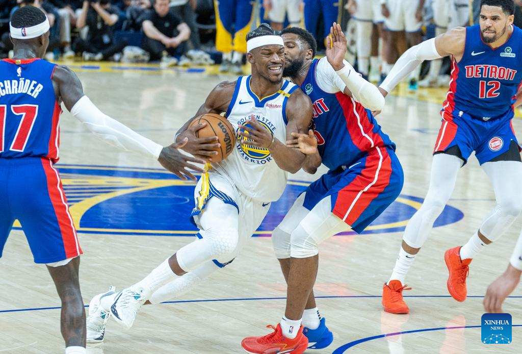 Jimmy Butler (2nd L) of Golden State Warriors competes during the 2024-2025 NBA regular season match between Detroit Pistons and Golden State Warriors in San Francisco, the United States, March 9, 2025. (Photo by Arthur Dong/Xinhua)