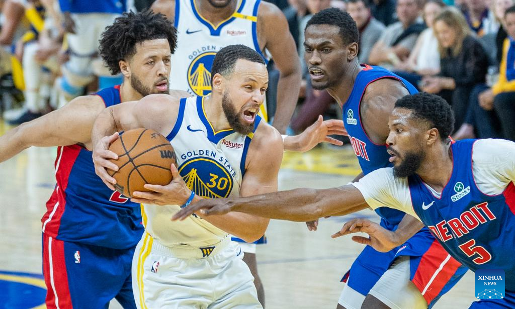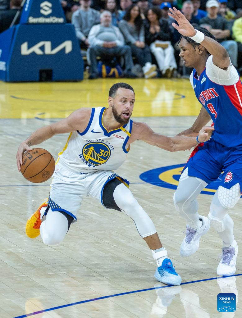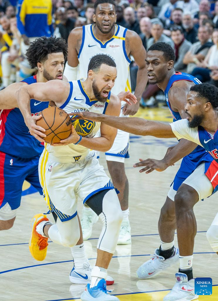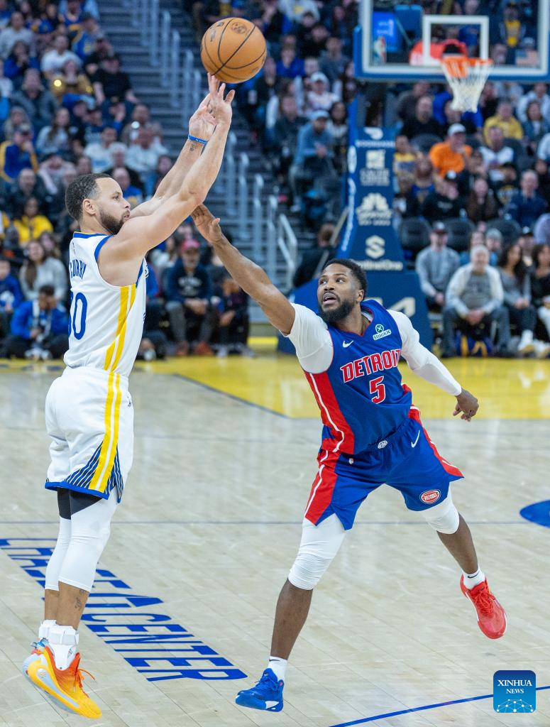Stephen Curry (2nd L) of Golden State Warriors competes during the 2024-2025 NBA regular season match between Detroit Pistons and Golden State Warriors in San Francisco, the United States, March 9, 2025. (Photo by Arthur Dong/Xinhua)