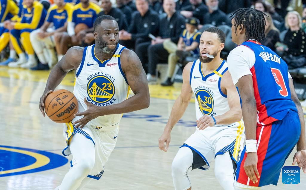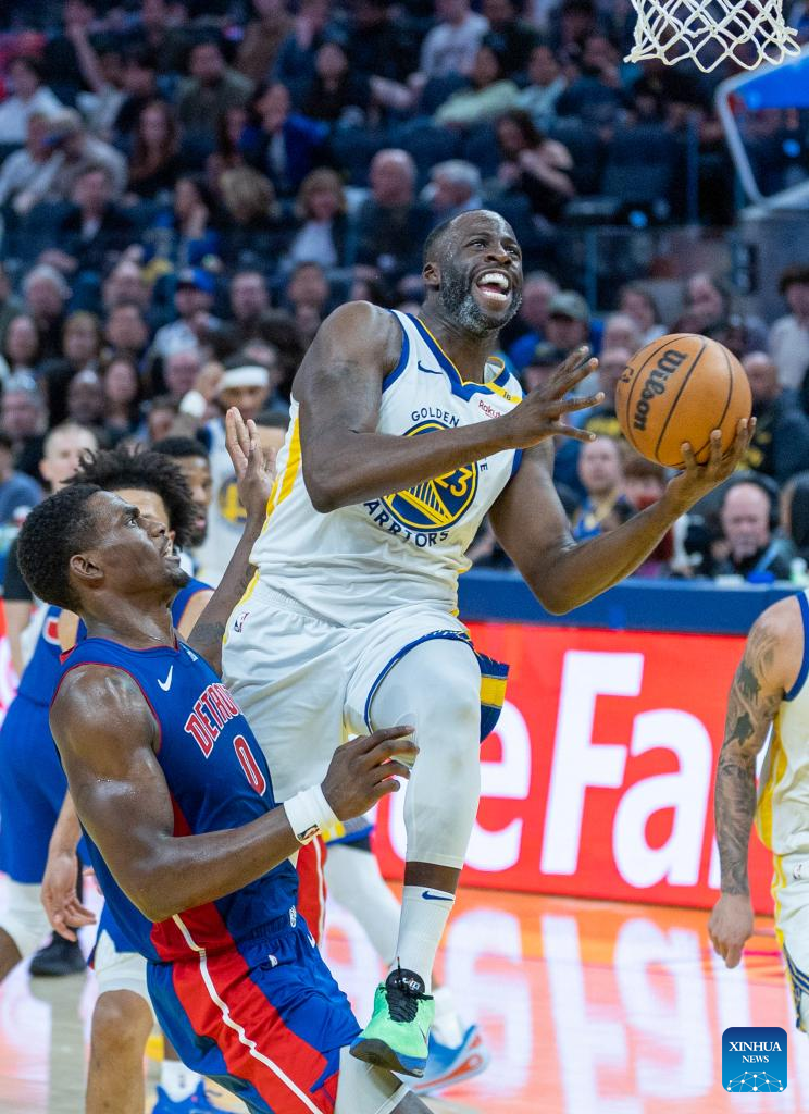 Draymond Green (C) of Golden State Warriors competes during the 2024-2025 NBA regular season match between Detroit Pistons and Golden State Warriors in San Francisco, the United States, March 9, 2025. (Photo by Arthur Dong/Xinhua)