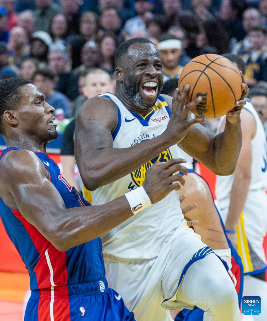 Draymond Green (L) of Golden State Warriors competes during the 2024-2025 NBA regular season match between Detroit Pistons and Golden State Warriors in San Francisco, the United States, March 9, 2025. (Photo by Arthur Dong/Xinhua)