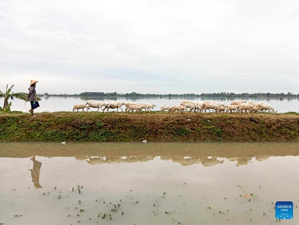 This photo taken with a mobile phone shows a shepherd and his flock passing by submerged area after heavy rainfall in Grobogan Regency, Central Java, Indonesia, March 10, 2025. (Photo by Kalila/Xinhua)