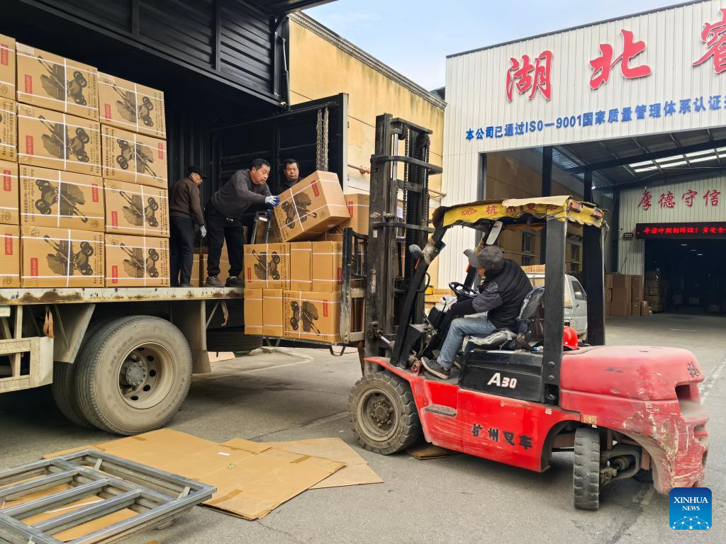 Workers load baby strollers onto a truck at Hubei Ruizhi Children Appliances Co., Ltd. in Xiaogan City, central China's Hubei Province, Jan. 8, 2025. (Xinhua/Tian Zhongquan)