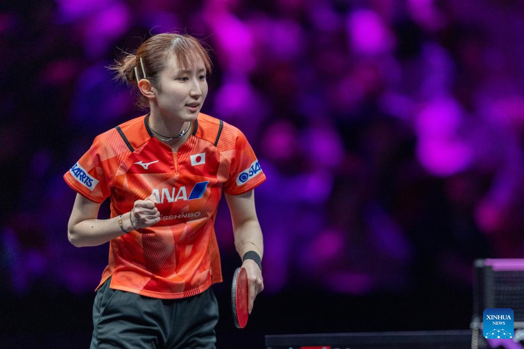 Hayata Hina of Japan celebrates scoring during the women's singles round of 32 match against Huang Yi-Hua of Chinese Taipei at the WTT Champions Chongqing 2025 in Chongqing, southwest China, March 11, 2025. (Xinhua/Huang Wei)