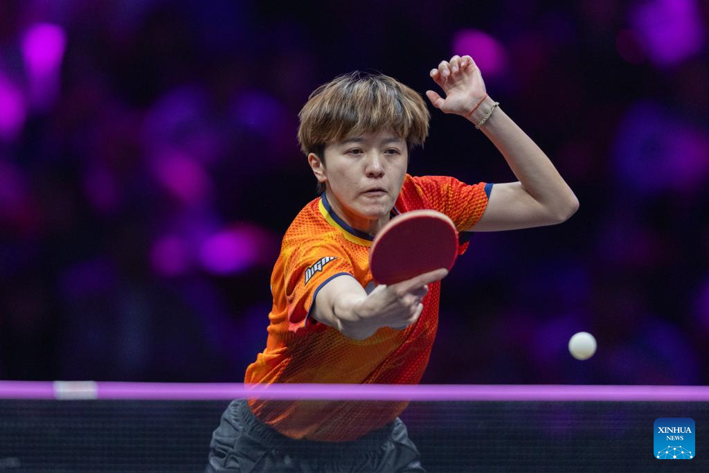 Sun Yingsha of China hits a return during the women's singles round of 32 match against Sofia Polcanova of Austria at the WTT Champions Chongqing 2025 in Chongqing, southwest China, March 11, 2025. (Xinhua/Huang Wei)