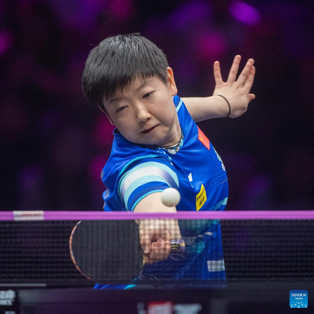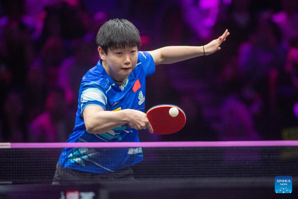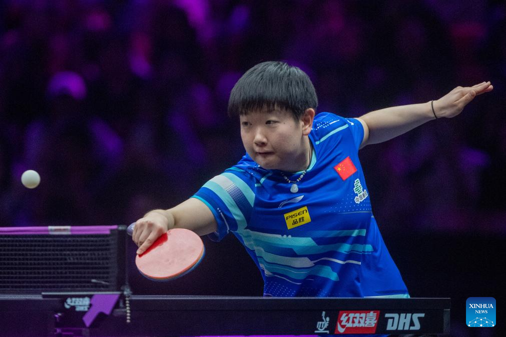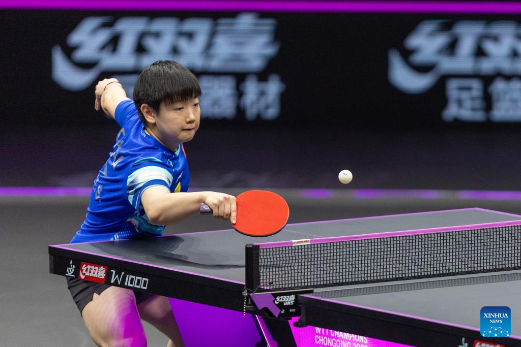 Sun Yingsha of China hits a return during the women's singles round of 32 match against Sofia Polcanova of Austria at the WTT Champions Chongqing 2025 in Chongqing, southwest China, March 11, 2025. (Xinhua/Tang Yi)