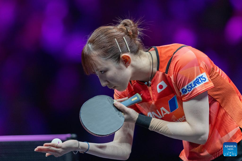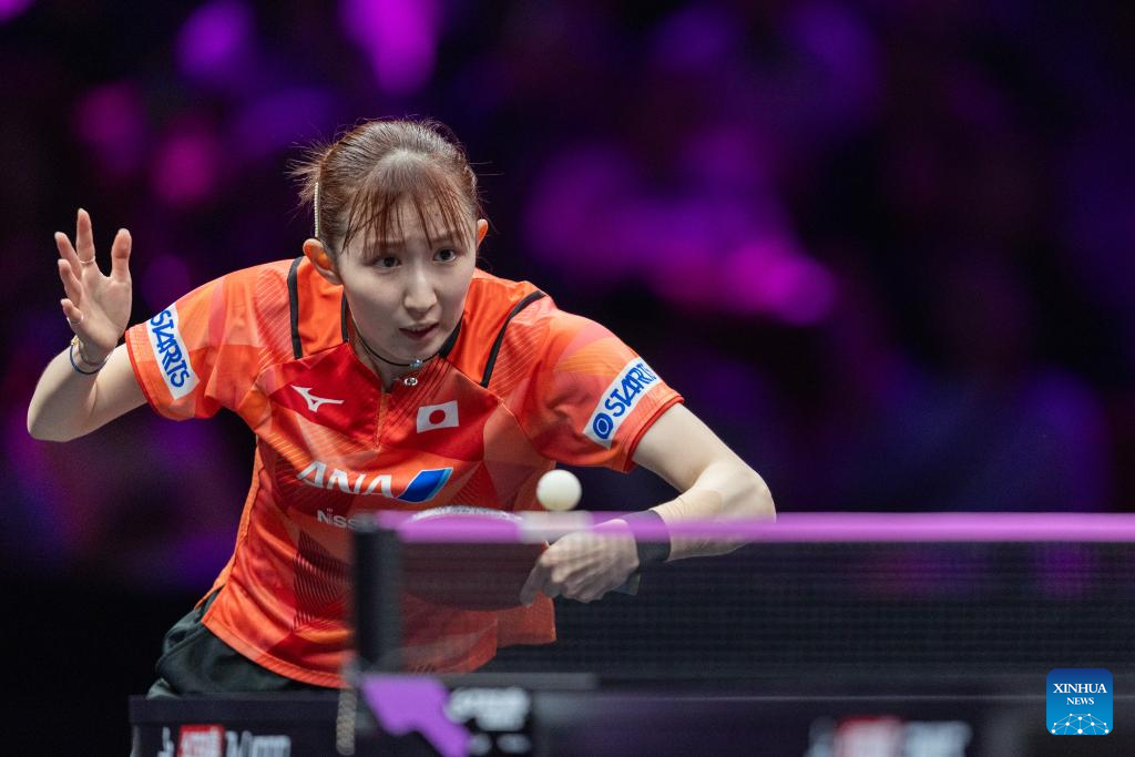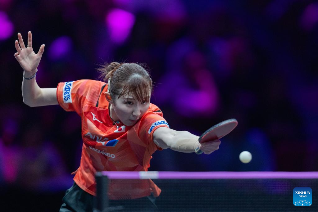 Hayata Hina of Japan hits a return during the women's singles round of 32 match against Huang Yi-Hua of Chinese Taipei at the WTT Champions Chongqing 2025 in Chongqing, southwest China, March 11, 2025. (Xinhua/Huang Wei)