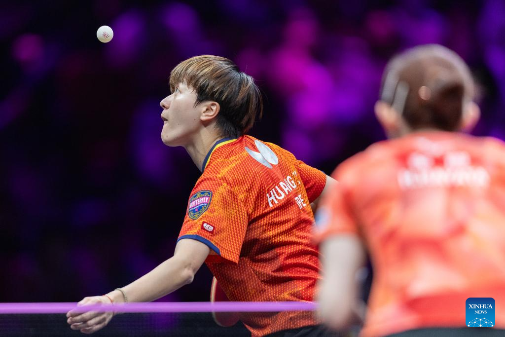 Huang Yi-Hua of Chinese Taipei hits a return during the women's singles round of 32 match against Hayata Hina of Japan at the WTT Champions Chongqing 2025 in Chongqing, southwest China, March 11, 2025. (Xinhua/Huang Wei)