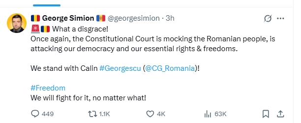 George Simion, leader of the AUR party and a Georgescu supporter, condemned the ruling on X, arguing that the court was undermining democracy and essential rights.