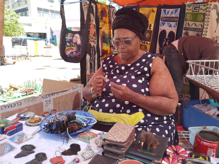 In Windhoek's central business district, Christina Omole has transformed a public space into an open-air gallery, showcasing jewelry, handicrafts, and textiles at her makeshift stall.