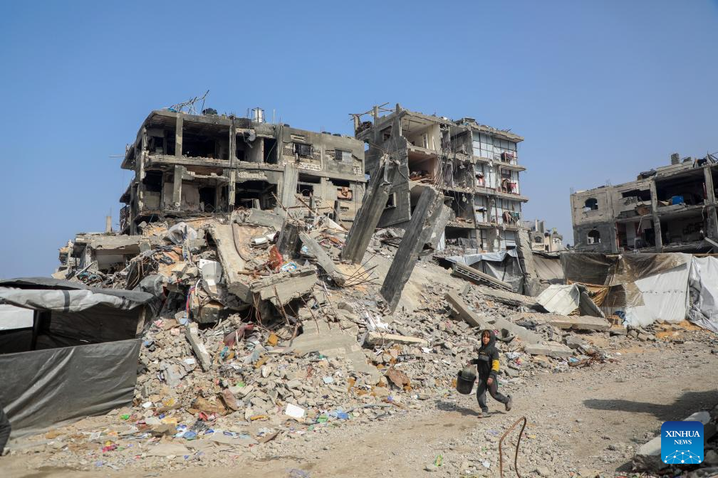 A Palestinian fetches water for daily use among destroyed buildings during Ramadan in Jabalia refugee camp, northern Gaza Strip, on March 5, 2025. (Photo by Rizek Abdeljawad/Xinhua)