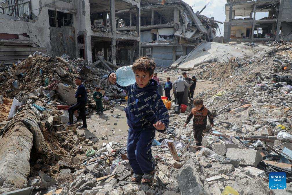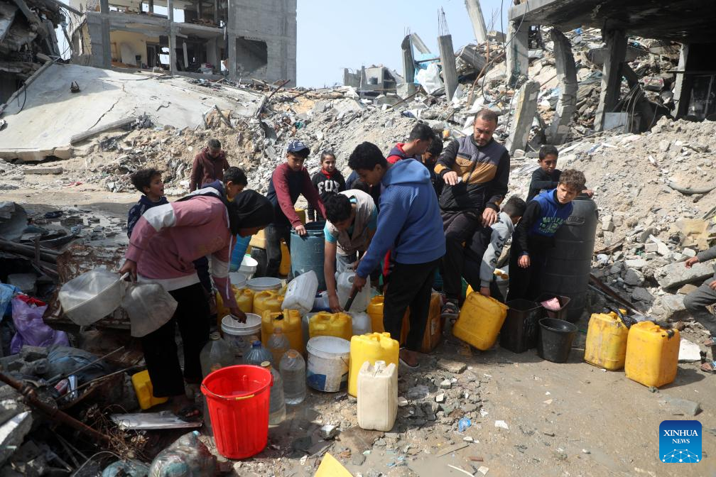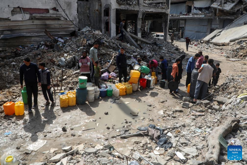 Palestinians fetch water for daily use among destroyed buildings during Ramadan in Jabalia refugee camp, northern Gaza Strip, on March 5, 2025. (Photo by Rizek Abdeljawad/Xinhua)