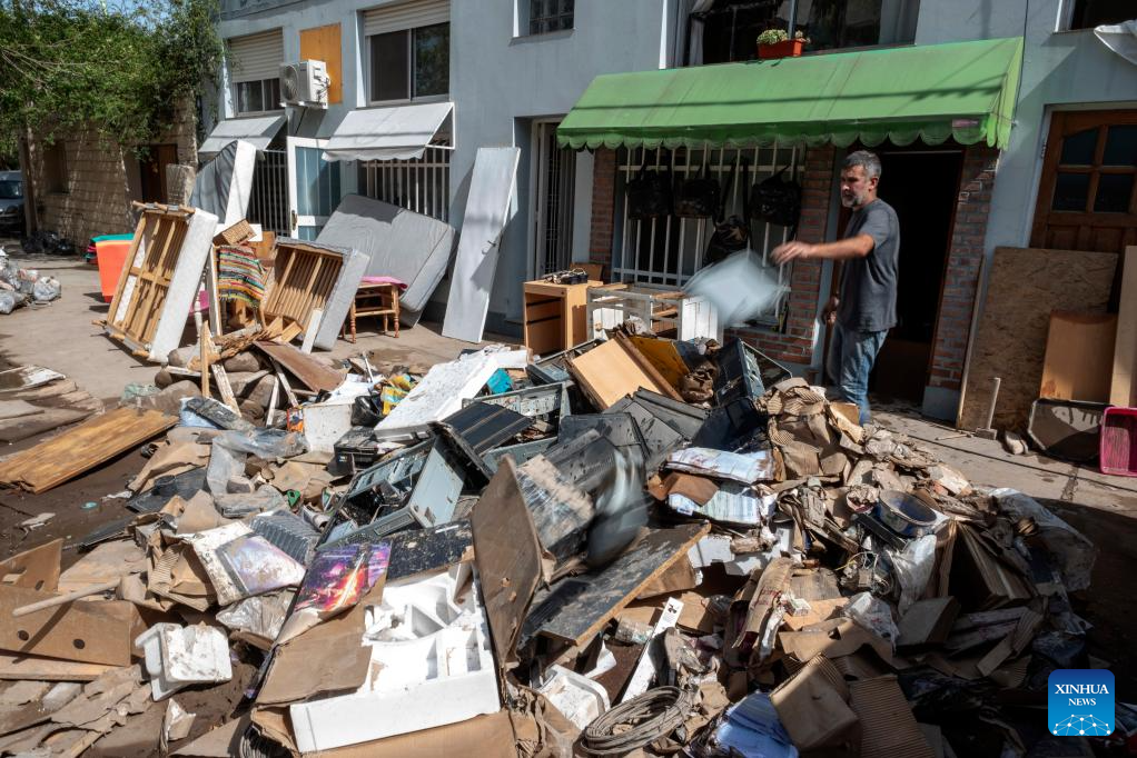 A man clears up flood-damaged furniture in Bahia Blanca, Argentina, March 10, 2025. The death toll from the intense storm that struck the southern Argentine port city of Bahia Blanca has risen to 16. (Photo by Martín Zabala/Xinhua)